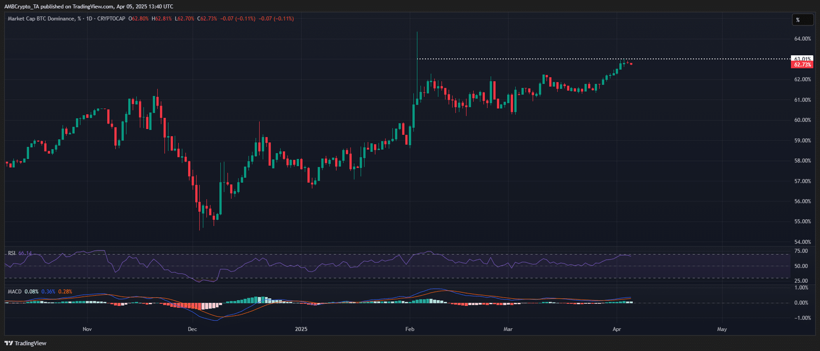 At press time, the Relative Strength Index (RSI) was deeply overbought, increasing the likelihood of a corrective retracement, while the MACD bearish crossover signaled a momentum shift as BTC.D tests the key 63% resistance level.