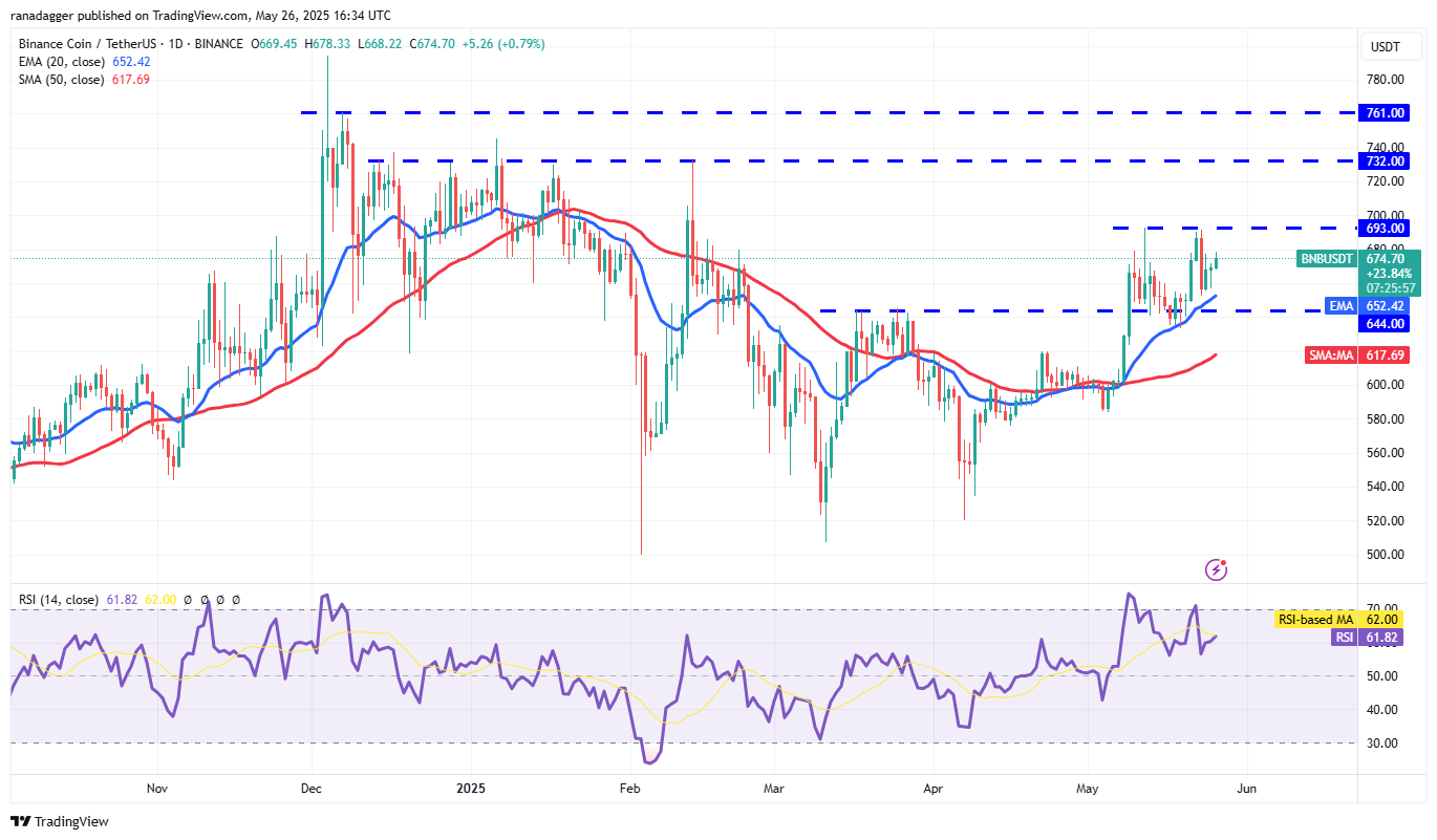 BNB (BNB) has started to move toward the overhead resistance of $693 after taking support at the 20-day EMA ($652).
