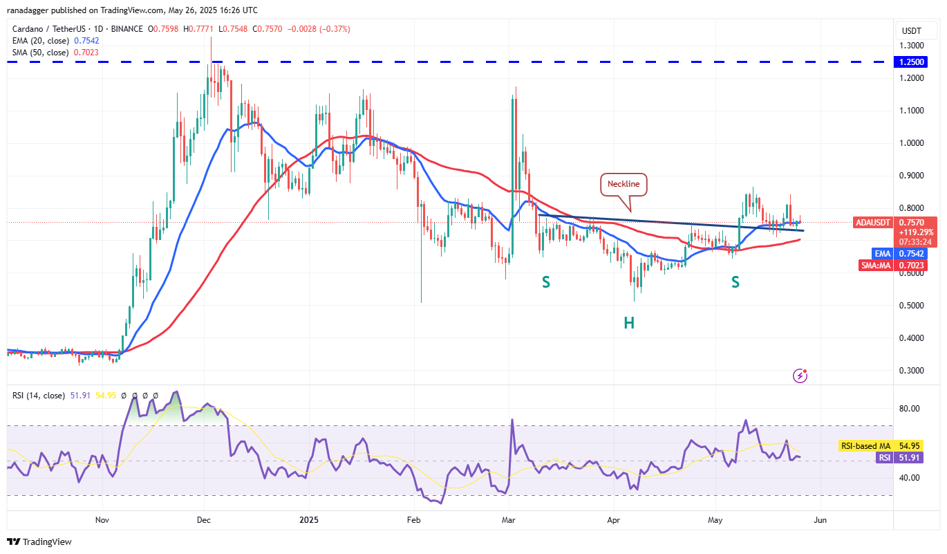 Buyers are trying to keep Cardano (ADA) above the neckline of the inverse head-and-shoulders pattern but have failed to start a strong rebound.