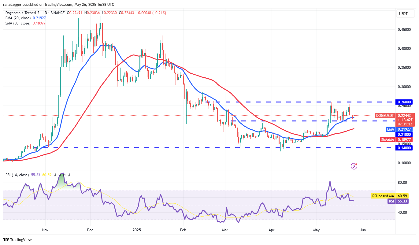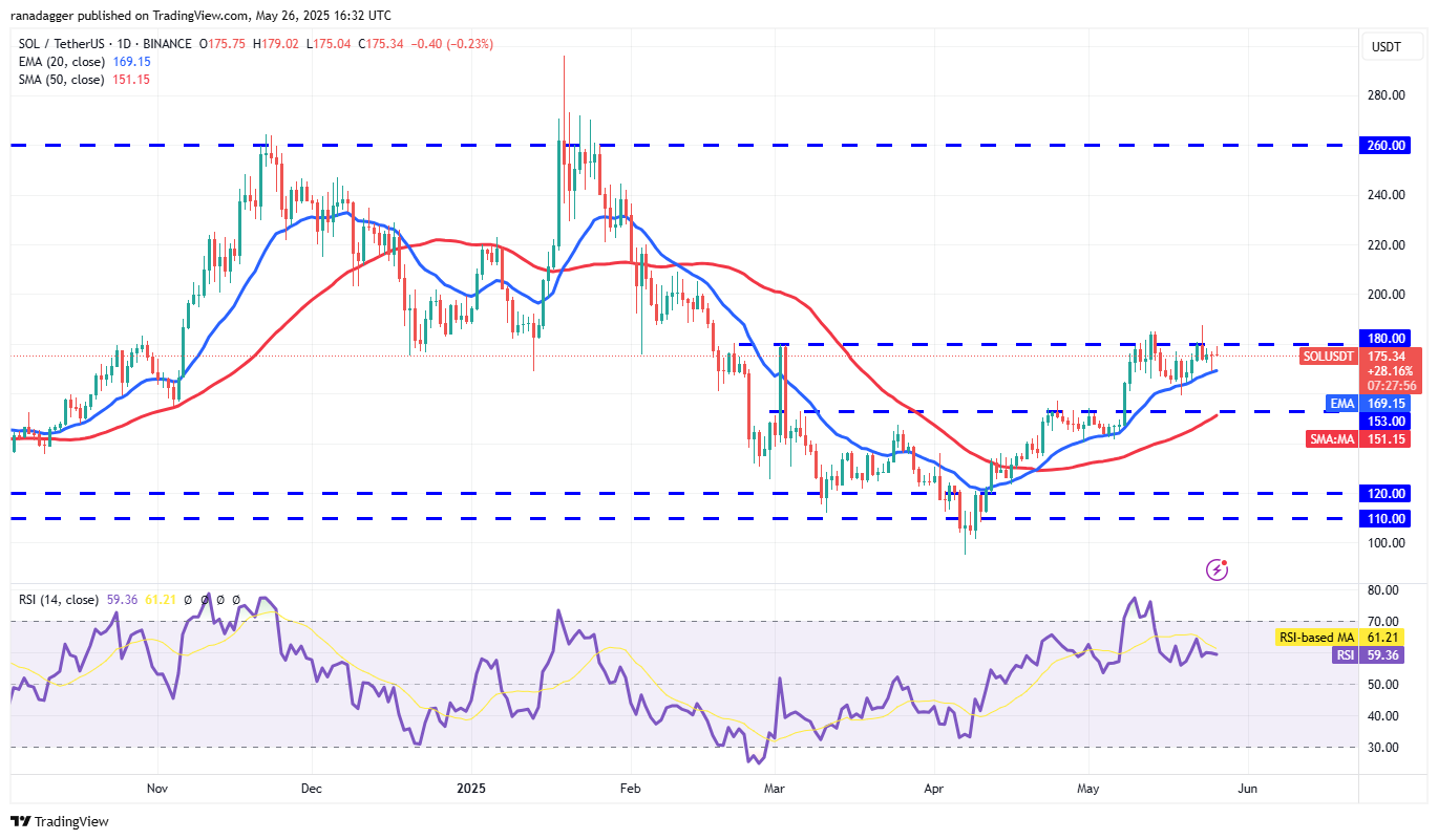 Solana (SOL) took support at the 20-day EMA ($169) on May 25, indicating that the sentiment remains positive and traders are buying on minor dips.