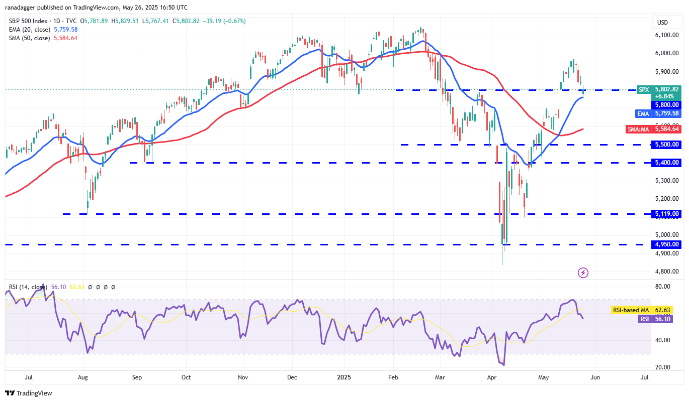 If the price rebounds off the 20-day EMA, the index could gradually climb toward the overhead resistance of 6,000. Sellers are expected to pose a strong challenge in the 6,000 to 6,147 zone.