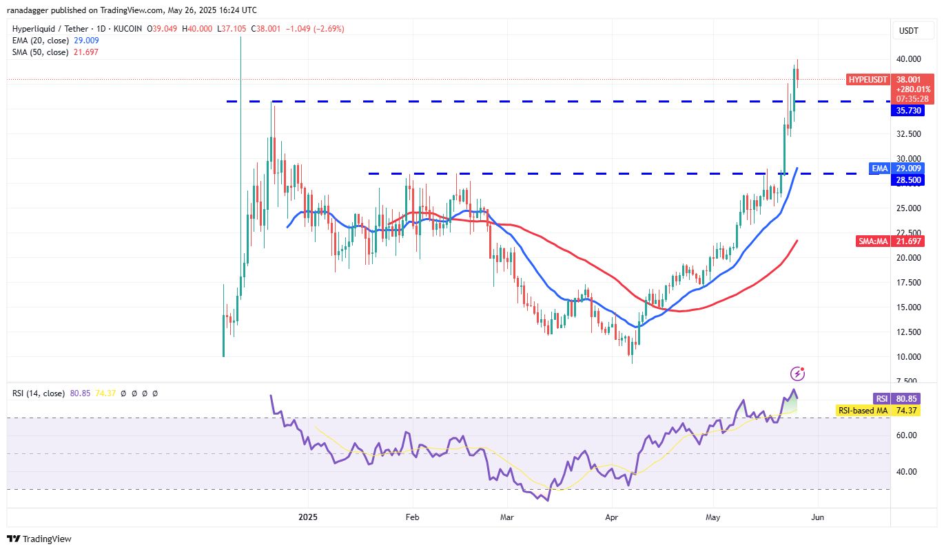 Hyperliquid (HYPE) has been in a strong uptrend for the past several days. Buyers asserted their supremacy by pushing the price above the $35.73 resistance on May 25.