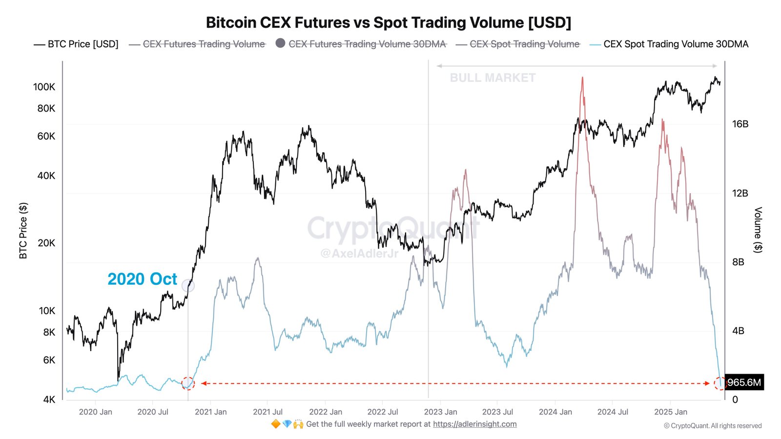 Parallel to technical indicators, market sentiment has shifted toward accumulation. According to data shared by Bitcoin researcher Axel Adler Jr., the average spot trading volumes on centralized exchanges (CEXs) have plunged to levels last seen in October 2020.