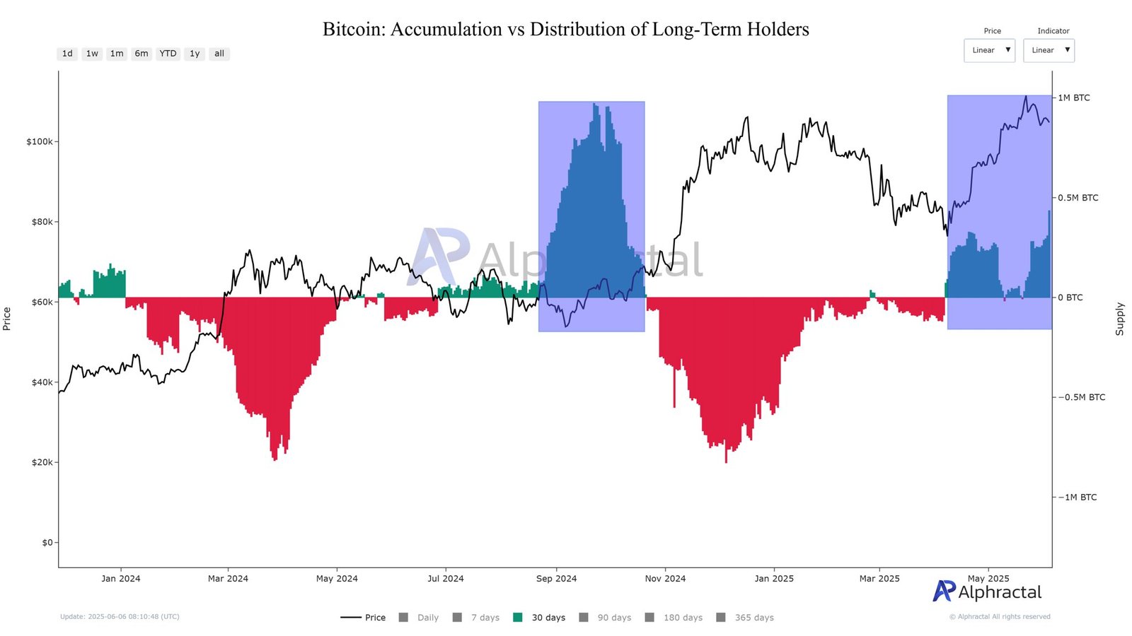 Supporting this shift, onchain analyst Boris highlighted diverging behavior between short and long-term Bitcoin holders. Over the past 30 days, short-term holders (STHs) have distributed 592,000 BTC as BTC rallied toward $110,000, signaling uncertainty or profit-taking. In contrast, long-term holders (LTHs)—wallets holding BTC for over 155 days—have accumulated 605,000 BTC since the all-time high. Boris explained: