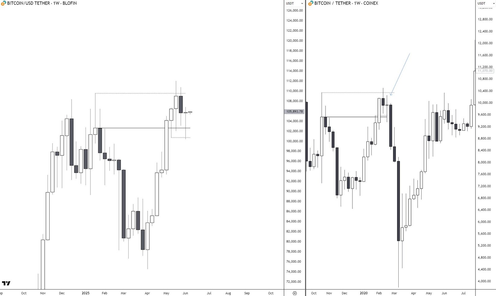 “A weekly #Bitcoin Doji after rejecting swing highs the week before means nothing by itself. Literally the same thing happened before Covid (different context this time though). We need to see the price confirming with a break higher—if so, only then we run.”
