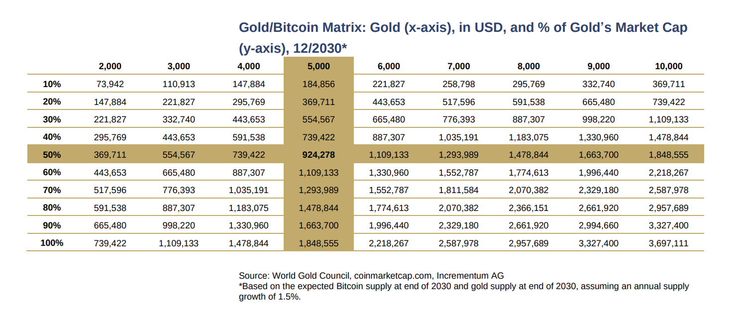 “If gold hits $5,000/oz by 2030 and Bitcoin captures 50% of its market cap, that puts BTC at $924K,” Callahan noted, alongside the data from the latest report by In Gold We Trust, released this week.