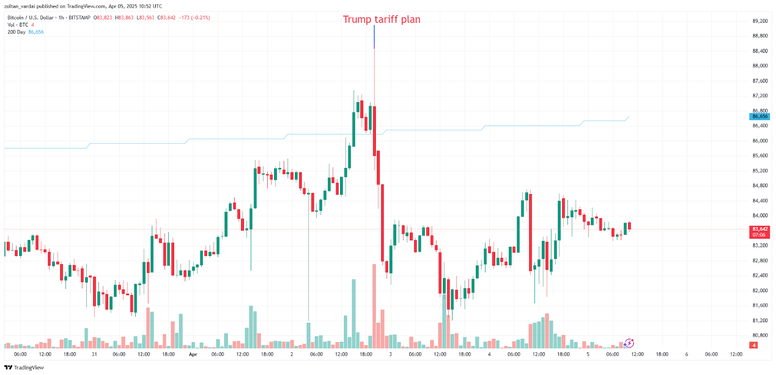 While stocks plunged, Bitcoin dipped just 3.7% over the same two-day period, trading at around $83,600 as of April 5, according to TradingView data.