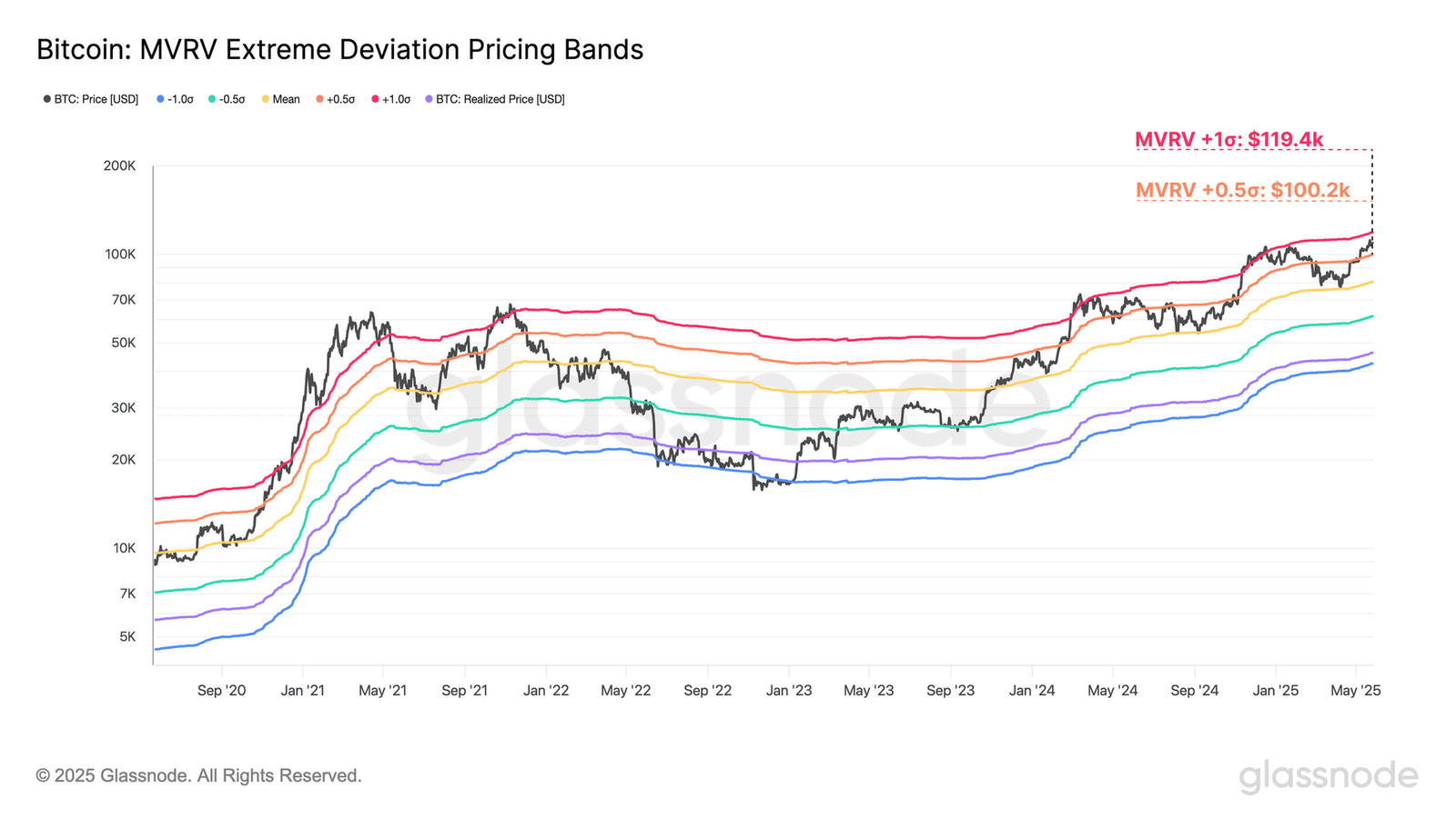 This line corresponds to the price at which the MVRV Ratio attains a value that’s 0.5 standard deviations above the all-time mean. At present, the level is situated around $100,200.