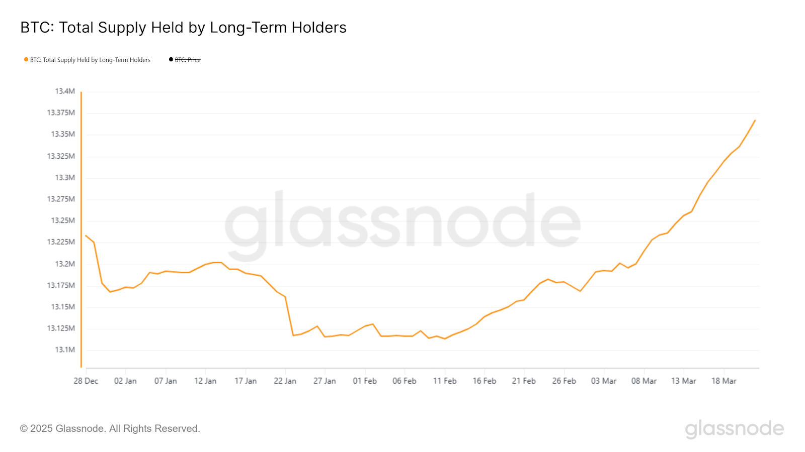 The total Bitcoin supply held by long-term holders increased by over 250,000 BTC in less than two months, from 13.1 million BTC on Feb. 11 to over 13.3 million on March 22, Glassnode data shows.