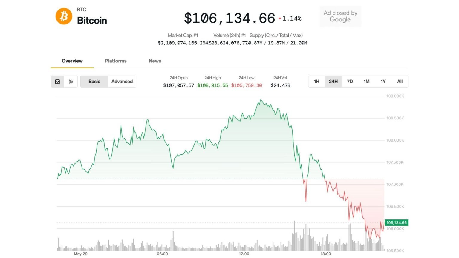 The top cryptocurrency hit a session low of $105,750 before rebounding to just above $106,000. It was down 1.5% in the last 24 hours, but still only 5% away from record high levels.