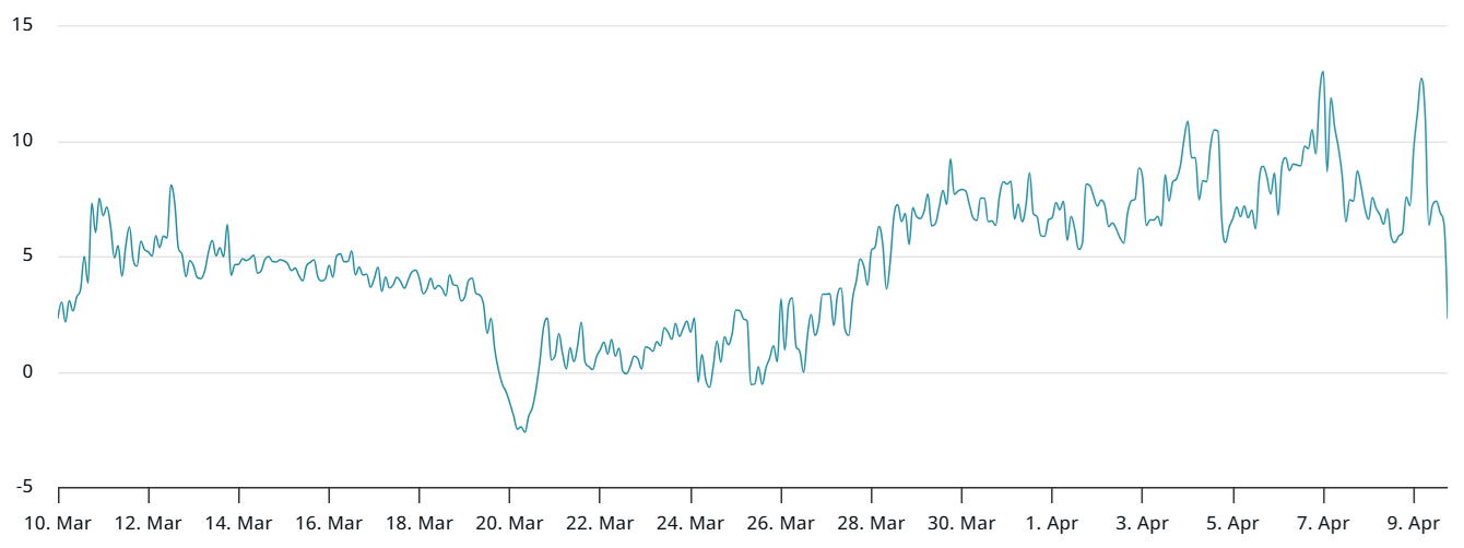 On April 9, the Bitcoin options delta skew peaked at 12% after China announced higher tariffs in retaliation. However, this trend reversed completely following President Trump’s announcement of a tariff pause, with the indicator returning to a neutral 3%. This shift suggests that options markets are now pricing equal probabilities for upward and downward price movements, marking the end of a bearish phase that began on March 29.