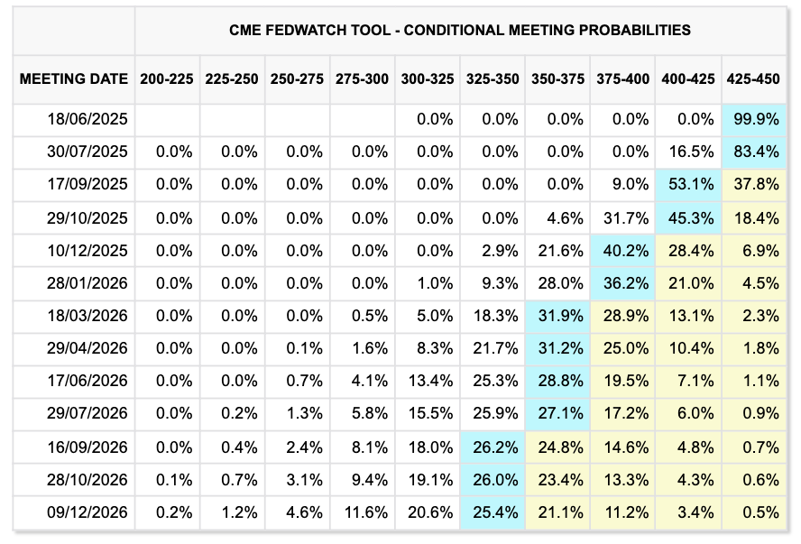 Only in September are expectations of a 0.25% decrease in the Fed funds rate on the table, per the latest data from CME Group’s FedWatch Tool.