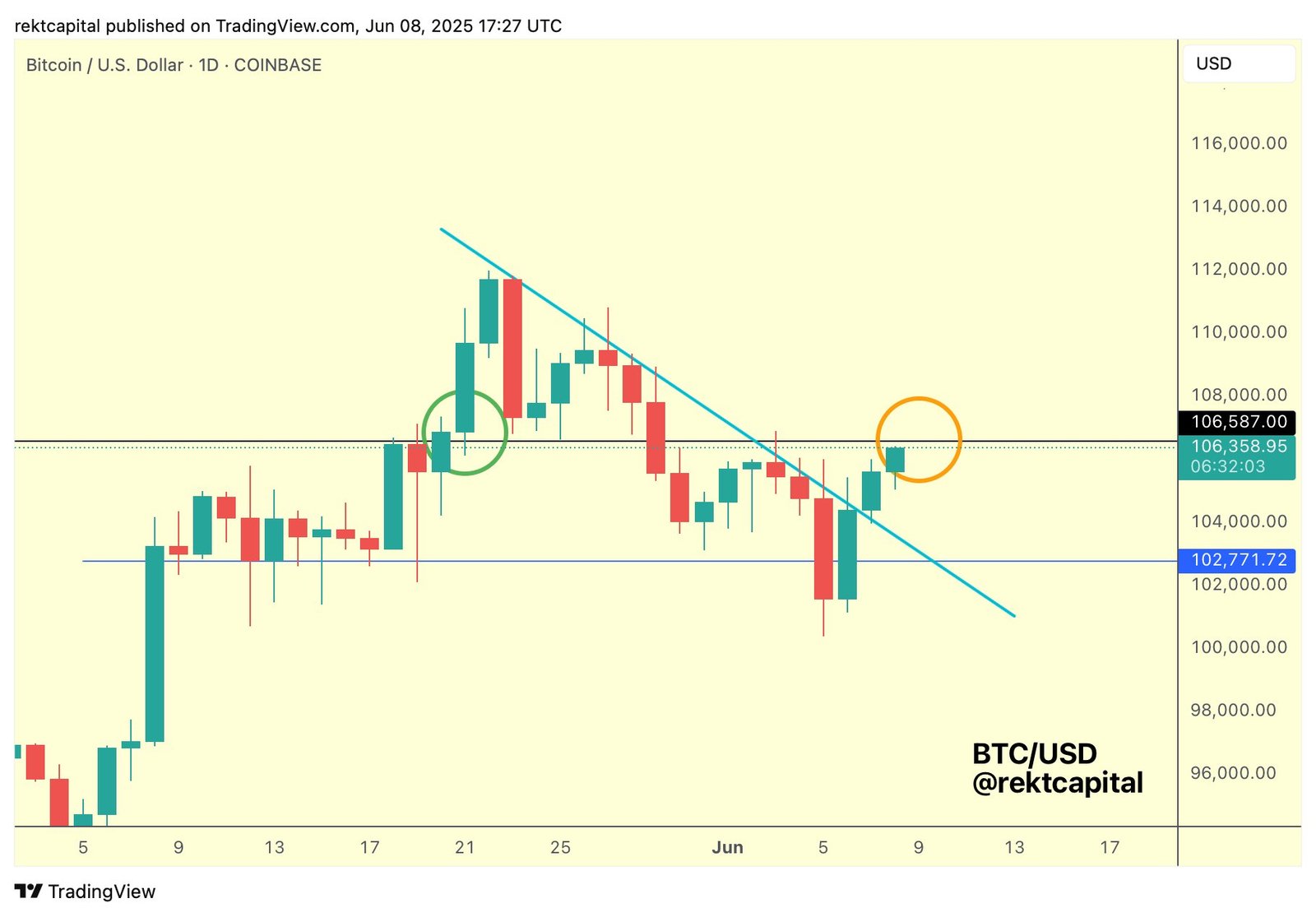 “Bitcoin has broken its two-week Downtrend (light blue). Now, Bitcoin is trying to challenge the $106600 resistance (black),” he told X followers in part of his ongoing analysis on June 8.
