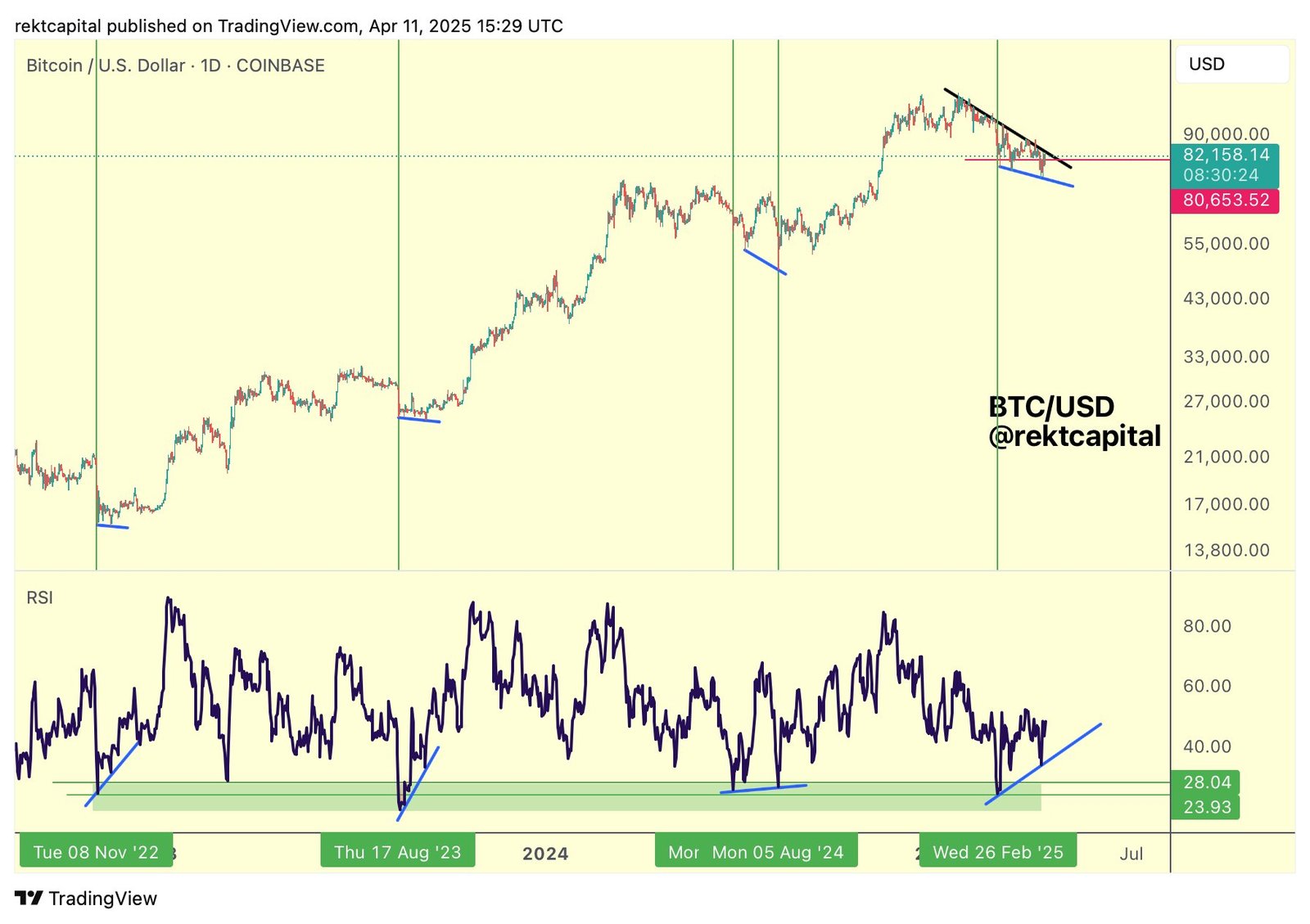 BTC/USD 1-day chart with RSI data. Source: Rekt Capital/X