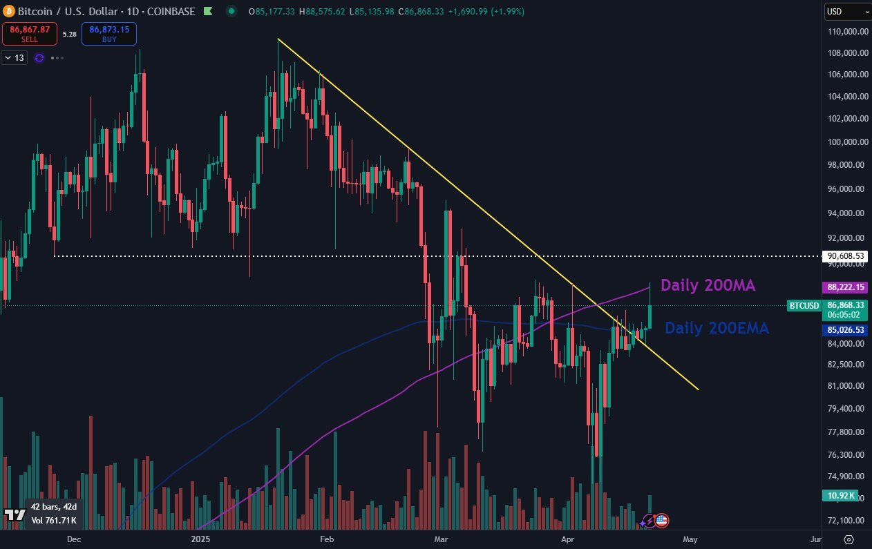 The 200-day SMA traditionally forms support during Bitcoin bull markets but was lost in March as crypto faced sell-side pressure when the US trade war began.