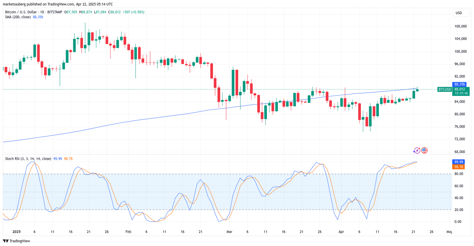 Data from Cointelegraph Markets Pro and TradingView shows BTC/USD cooling after hitting new April highs of $88,874.