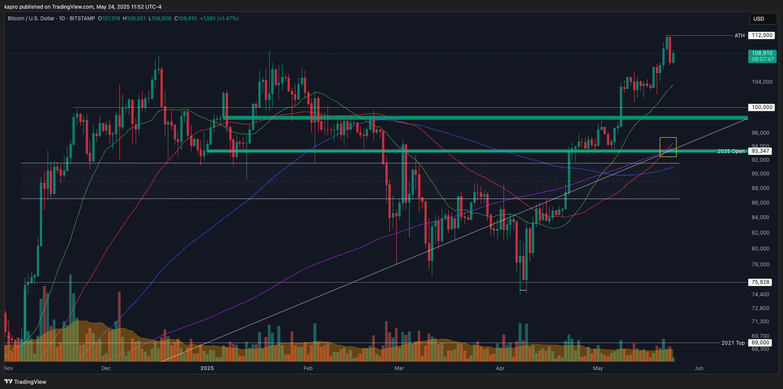 “The MACRO trend line and 2 key Moving Averages on the Bitcoin Daily chart currently have confluence with the Yearly Open,” he noted, referring to the BTC/USD 2025 opening level at around $93,500.