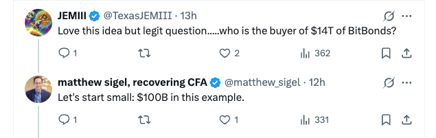 “The same thing if the coupon is sold at 2%, Bitcoin can go to zero, and the government still saves money versus the current market rate of 4%. And it’s in these 3% to 4% coupons where Bitcoin has to work in order for the government to save money.