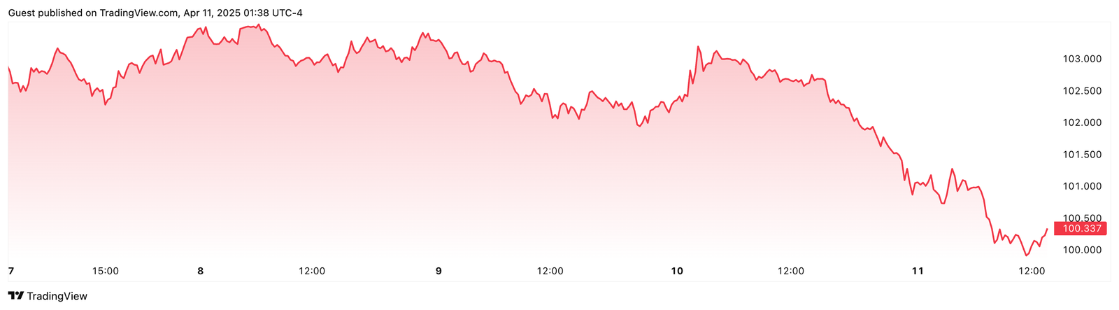 The US Dollar Index (DXY) is sitting at 100.337, down 2.92% over the past five days, according to TradingView data.