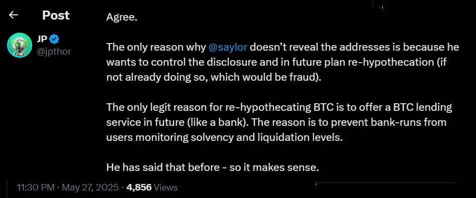 This lack of transparency sparked renewed speculation that some custodians might be engaging in re-hypothecation, using the same Bitcoin collateral multiple times to secure different financial commitments.