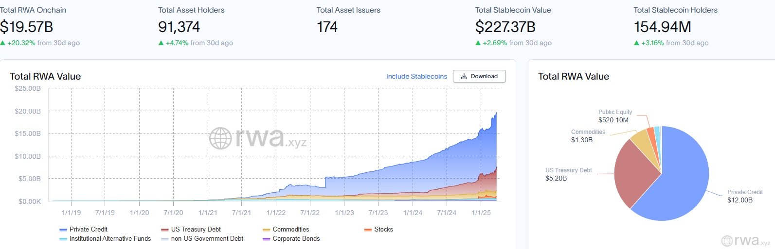 The total value of onchain RWAs is less than 0.5% away from surpassing the $20 billion mark, with a total cumulative value of $19.57 billion, according to data from RWA.xyz.