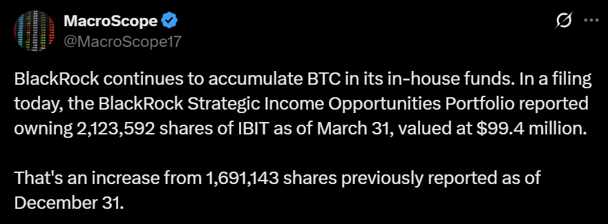 As of March 31, 2025, the BlackRock Strategic Income Opportunities Portfolio held 2,123,592 shares of the company’s iShares Bitcoin Trust (IBIT), valued at $99.4 million, according to filings with the US Securities and Exchange Commission (SEC). That’s a notable uptick from Dec. 31, 2024, when the portfolio held 1,691,143 IBIT shares.