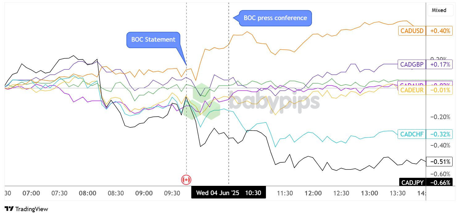 The Canadian dollar, which had been moving cautiously mixed against its counterparts ahead of the BOC announcement, had a brief bearish reaction to the central bank’s decision to keep rates on hold. Still, CAD quickly trimmed losses against the weaker USD while also recovering to pre-event levels against GBP, AUD and NZD before the press conference.