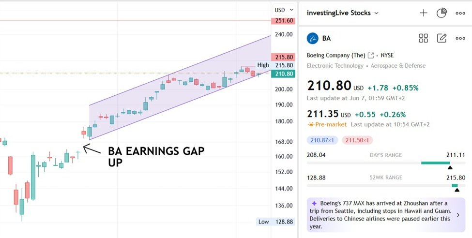 But let’s take a step back and check the latest earings and what the stock did since the… After that gap-up following earnings back in April, BA has been grinding higher in a pretty clear ascending channel. Even though it is imperfect, it is still an upward channel since that earnings gap up.