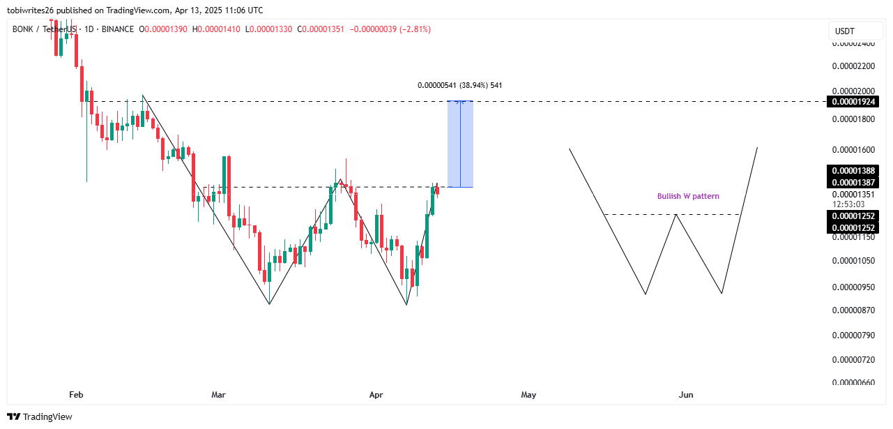 BONK has formed a bullish pattern known as the “W” pattern, known to act as a catalyst for assets to recover and record further market gains following a break of structure.