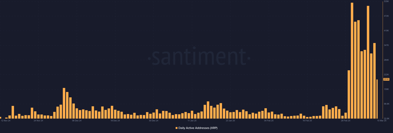 XRP’s daily active addresses have surged to 201.76K, indicating a notable rise in network activity. This increase suggests that more users are engaging with XRP, potentially anticipating a significant price movement.