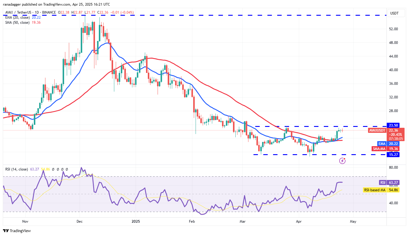Avalanche (AVAX) is facing resistance at the overhead resistance of $23.50, but a positive sign is that the bulls have not ceded much ground to the bears.