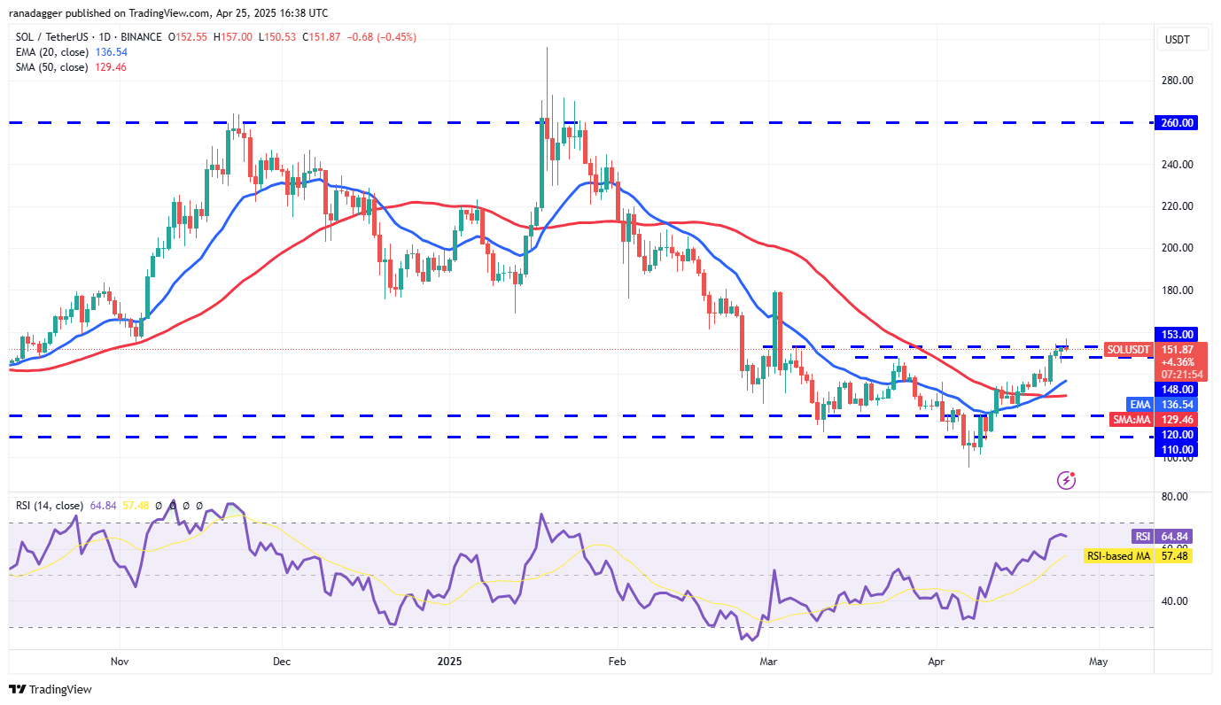 Solana (SOL) is struggling to stay above the $153 level, indicating that the bears are active at higher levels.