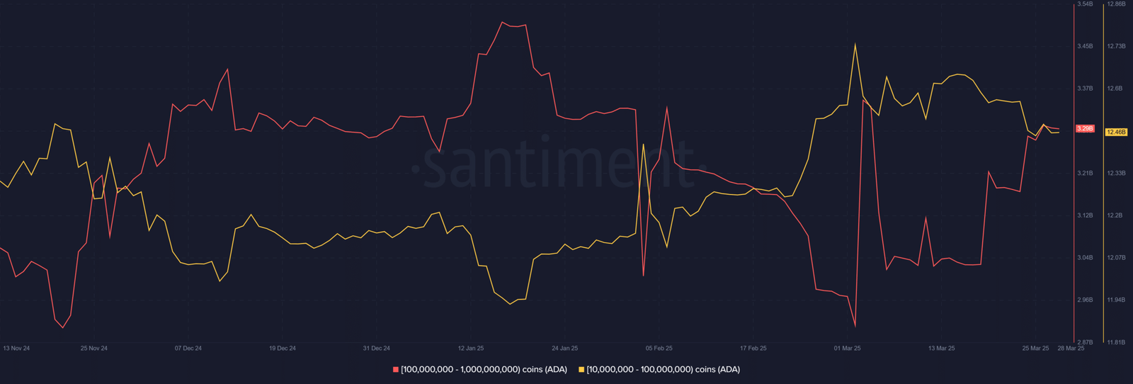 ADA’s price decline in March coincided with a large player’s sell-off, reducing holdings from 12.74 billion to 12.46 billion tokens.