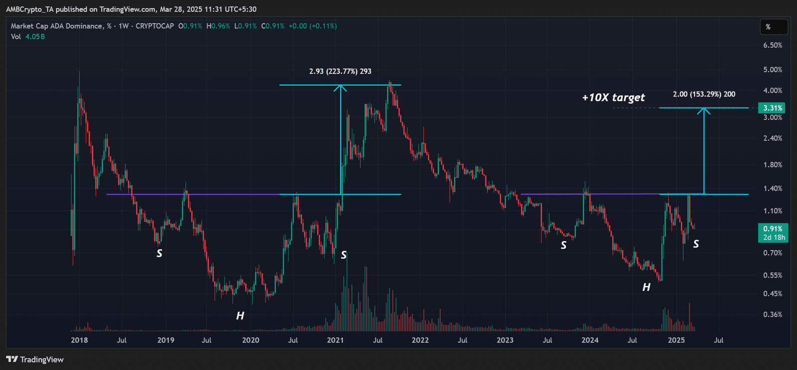 AMBCrypto reproduced a log scale of his ADA dominance chart to get a much clearer picture of his outlook.