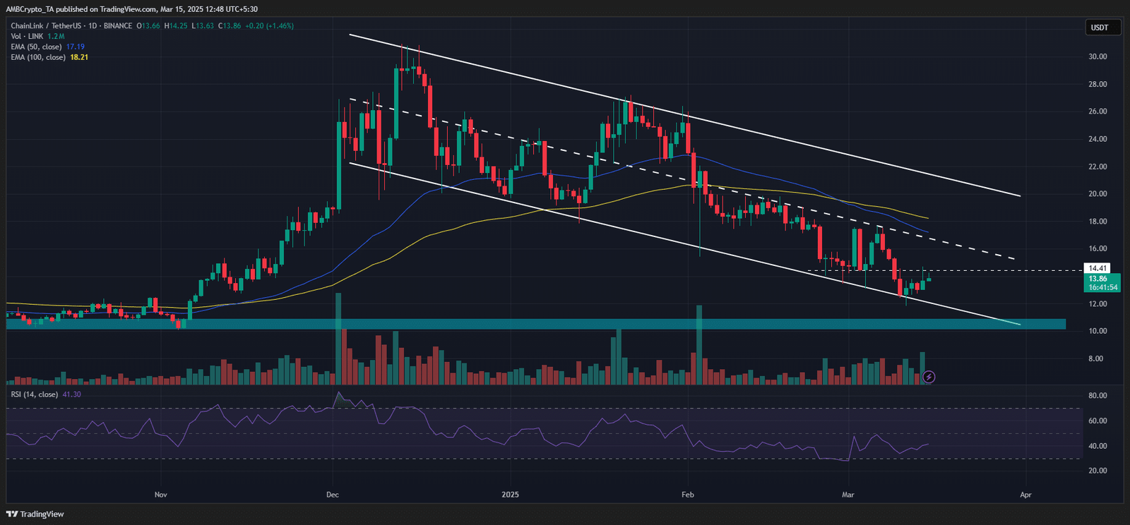 From a technical perspective on price, LINK bounced from its range-lows in the descending channel. If the rebound extends, the mid-range of $16-$17 could be tapped. However, sustained selling pressure could drag the altcoin to November U.S election levels of $10.