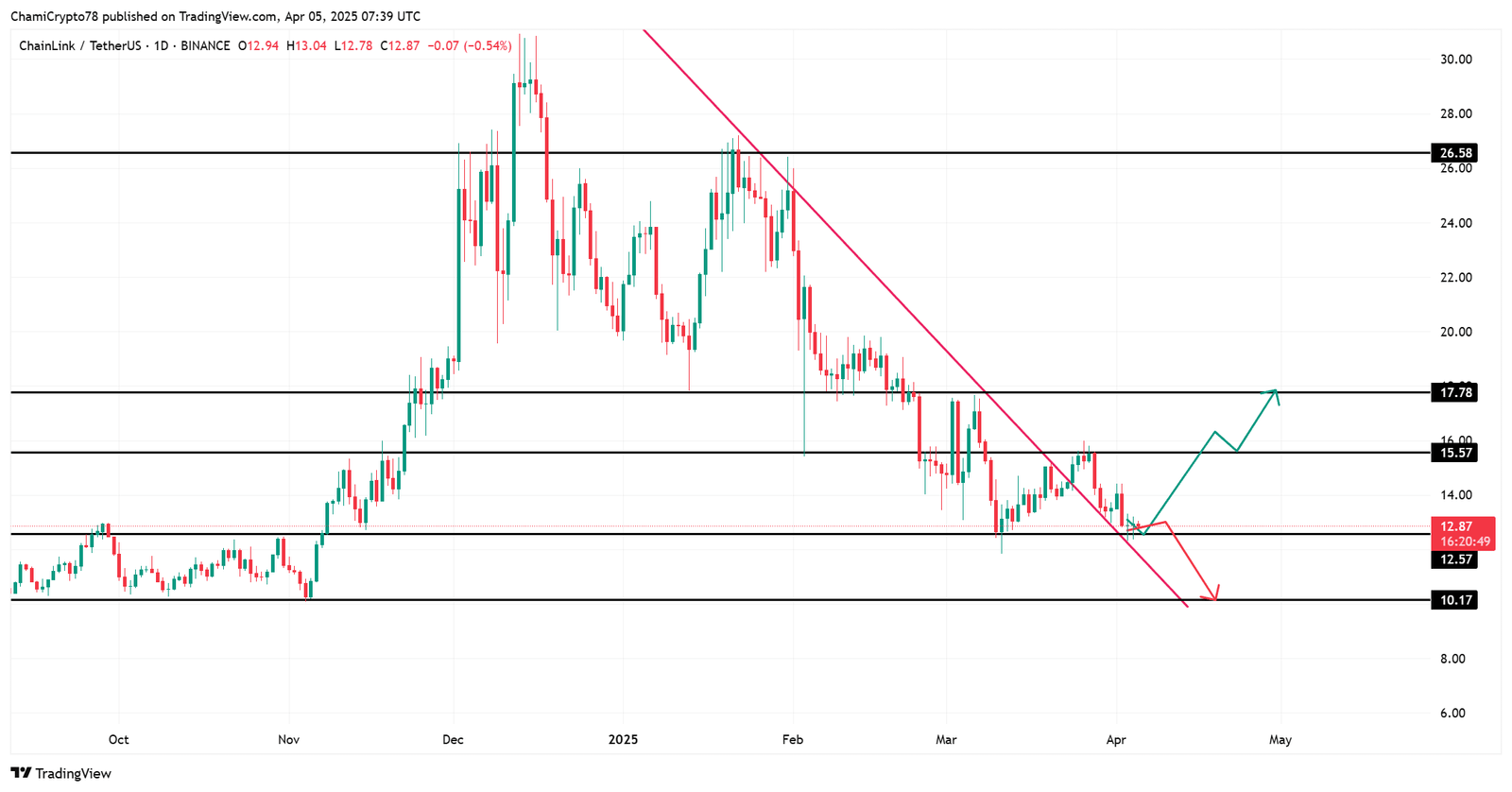 At the time of writing, LINK traded at $12.88, down 1.14% in the past 24 hours. Price action showed LINK bouncing around the $12.57 support zone after breaking a multi-month downtrend.