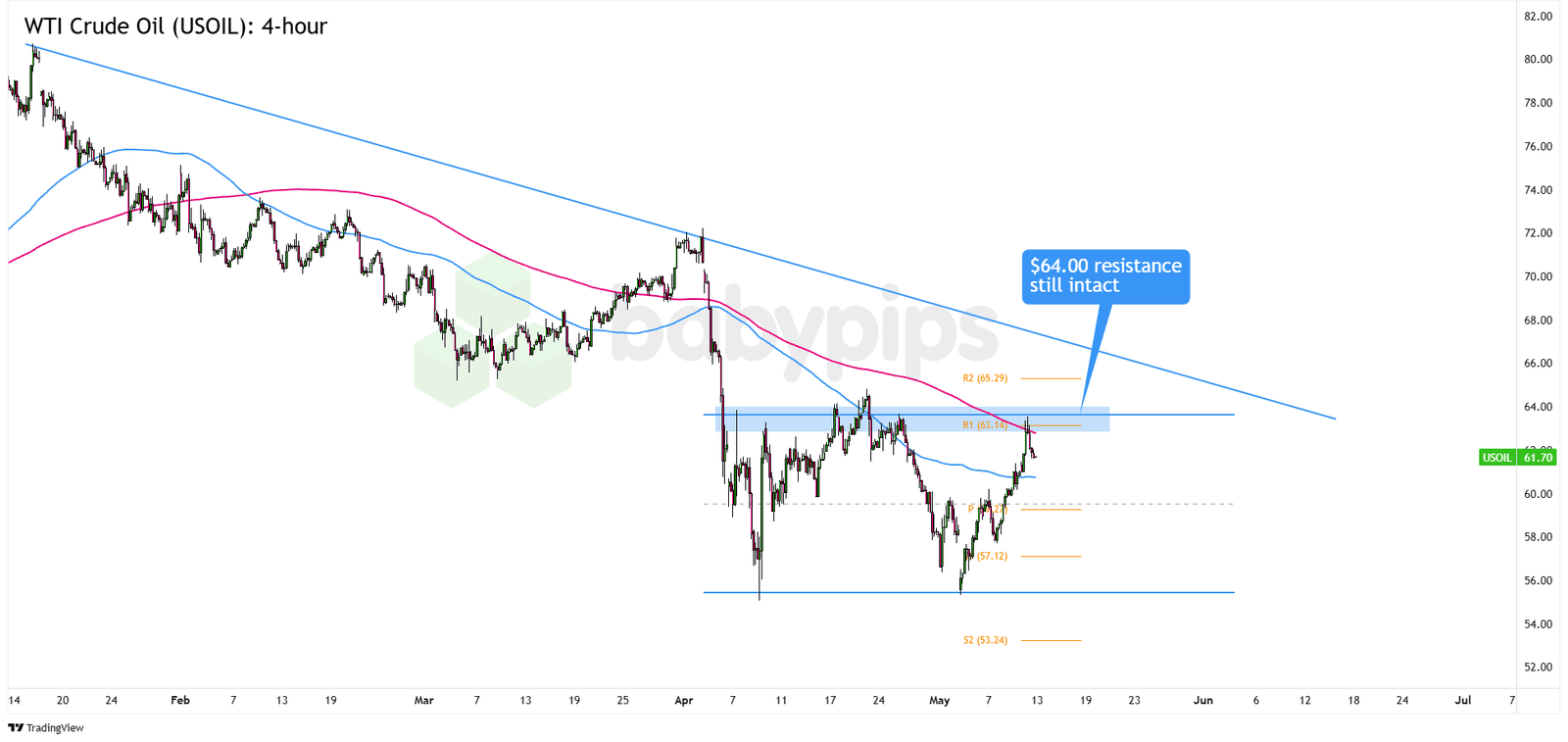 But if bulls push past the $64.00 highs, there’s room to run toward the R2 ($65.29) level or the $66.00 psychological barrier near long-term trend line resistance.