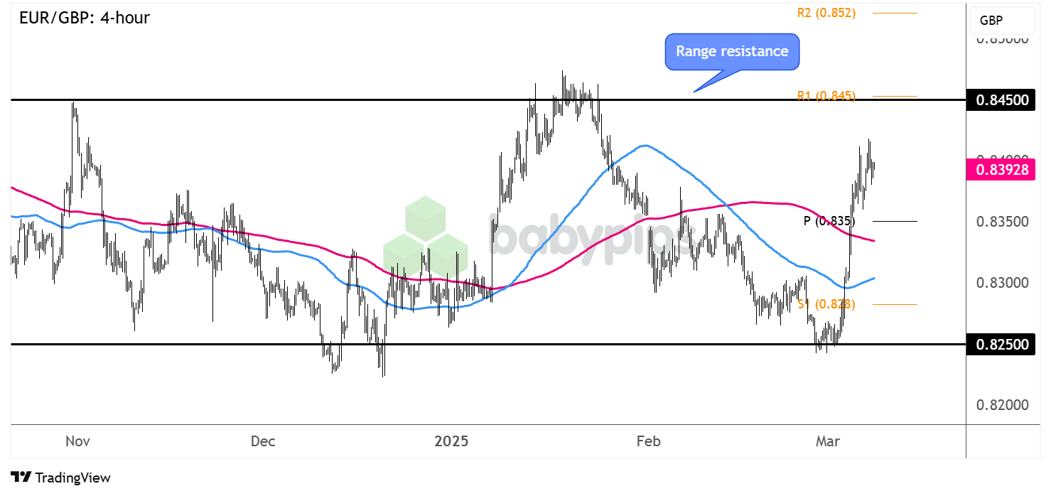 Shifting monetary policy biases for the European Central Bank (ECB) and Bank of England (BOE) since late last year have mostly kept this pair inside a range visible on the 4-hour time frame.