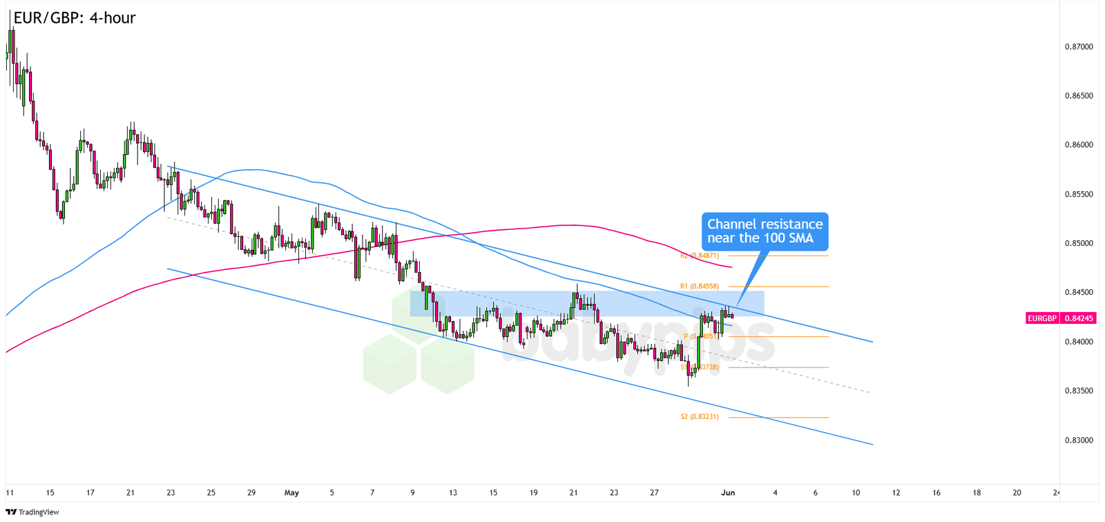 Bears could step back in soon, with .8425 sitting close to the 100 SMA on the 4-hour chart and the R1 Pivot Point at .8456.