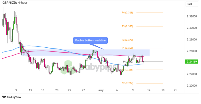 On the other hand, a bounce off current levels could spur another test of the neckline resistance or R1 (2.2650) at a minor psychological level. Watch out for a break above this area that could confirm the potential uptrend, which could last by the same height as the double bottom or roughly 400 pips.