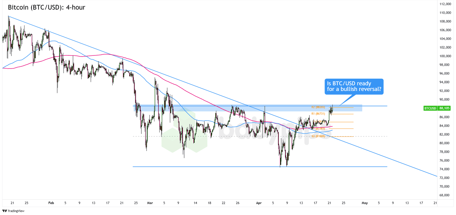 BTC/USD is testing the $88,200 zone, right around the R2 Pivot Point at $88,265 and a key resistance area that’s held since March.