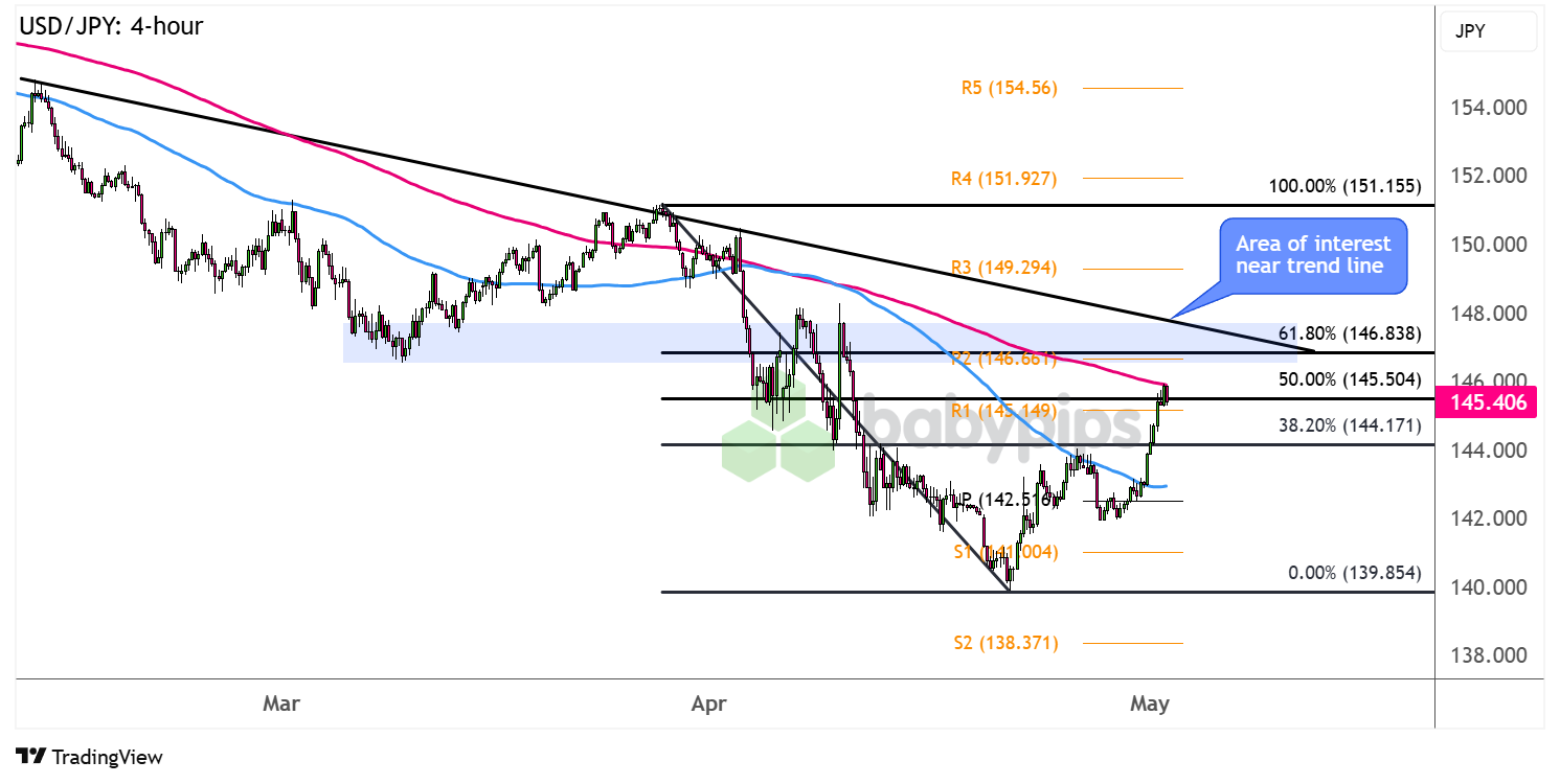 A larger pullback could test the former support turned resistance near the descending trend line and R2 (146.66), but keep an eye out for long green candlesticks close above this zone since those could point to a possible trend reversal.