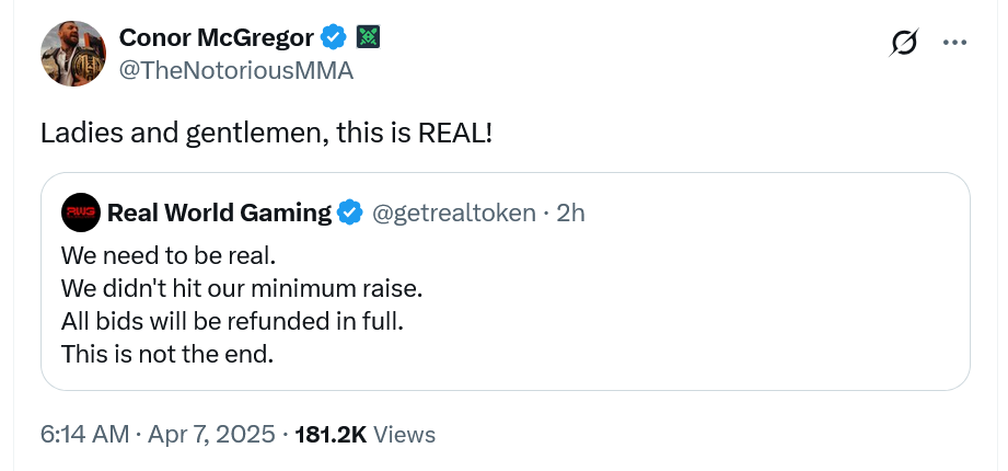“We need to be real. We didn’t hit our minimum raise,” the developers of the Real (REAL) token, Real World Gaming said in an April 6 X post, adding that “All bids will be refunded in full.”