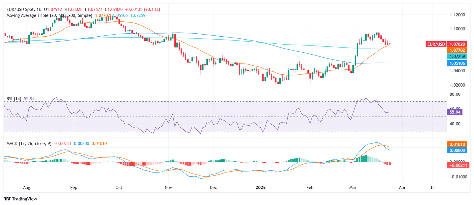 EUR/USD trades with slight weakness on Wednesday’s session after the European close, seen hovering around the 1.0800 zone. The pair remained within its daily range, reflecting limited directional conviction, but still holding above key moving averages that keep the broader bullish trend intact.