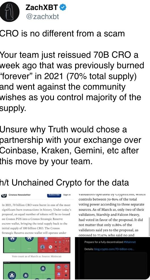 “CRO is no different from a scam,” ZachXBT said in a tweet, referring to a governance proposal last week that increased CRO supply by more than 200%.