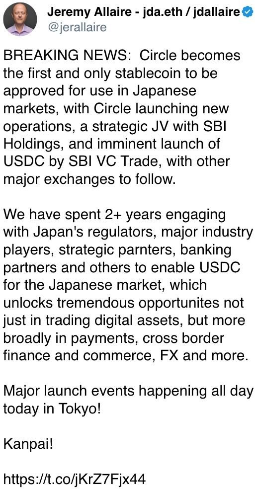 Circle to Launch USDC in Japan on March 26 With SBI Partnership (CoinDesk): Japan-based crypto exchange SBI VC Trade, which got regulatory approval on March 4 to list USDC, will start trading of the stablecoin on March 26.