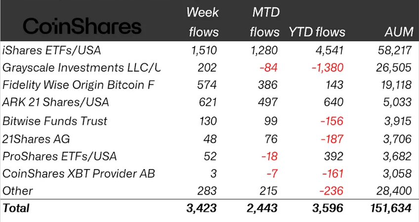 BlackRock’s iShares ETFs saw the largest inflows last week at $1.5 billion, with ARK and Fidelity following at $621 million and $574 million, respectively.