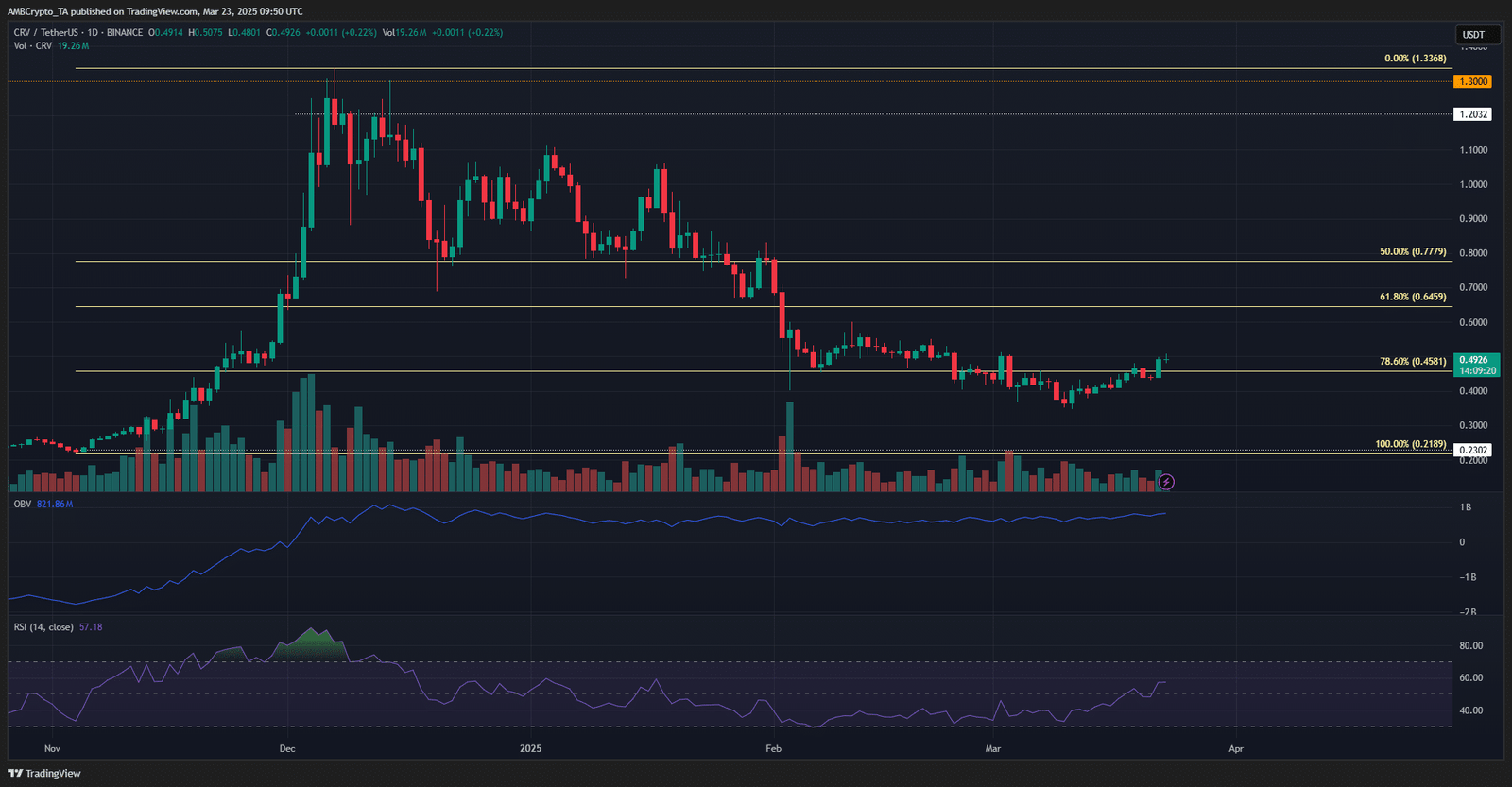 Further higher, the Fibonacci retracement levels would be the key resistances to overcome. BTC’s trends in the coming weeks could have a big influence on CRV’s performance.