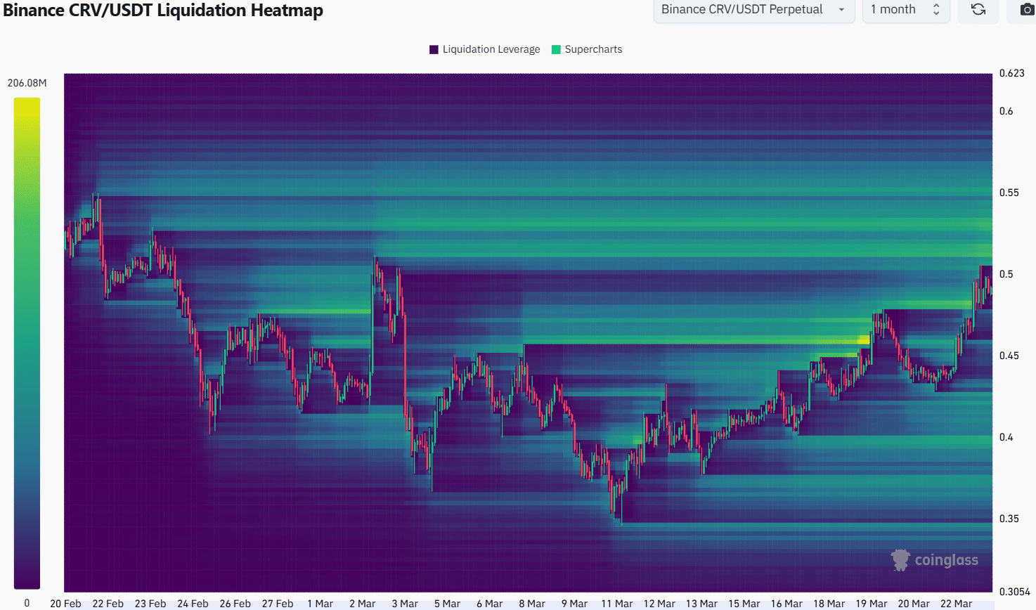 The 1-month liquidation heatmap showed that the area from $0.5-$0.55 was filled with liquidation levels. They could attract Curve prices higher in the coming days.