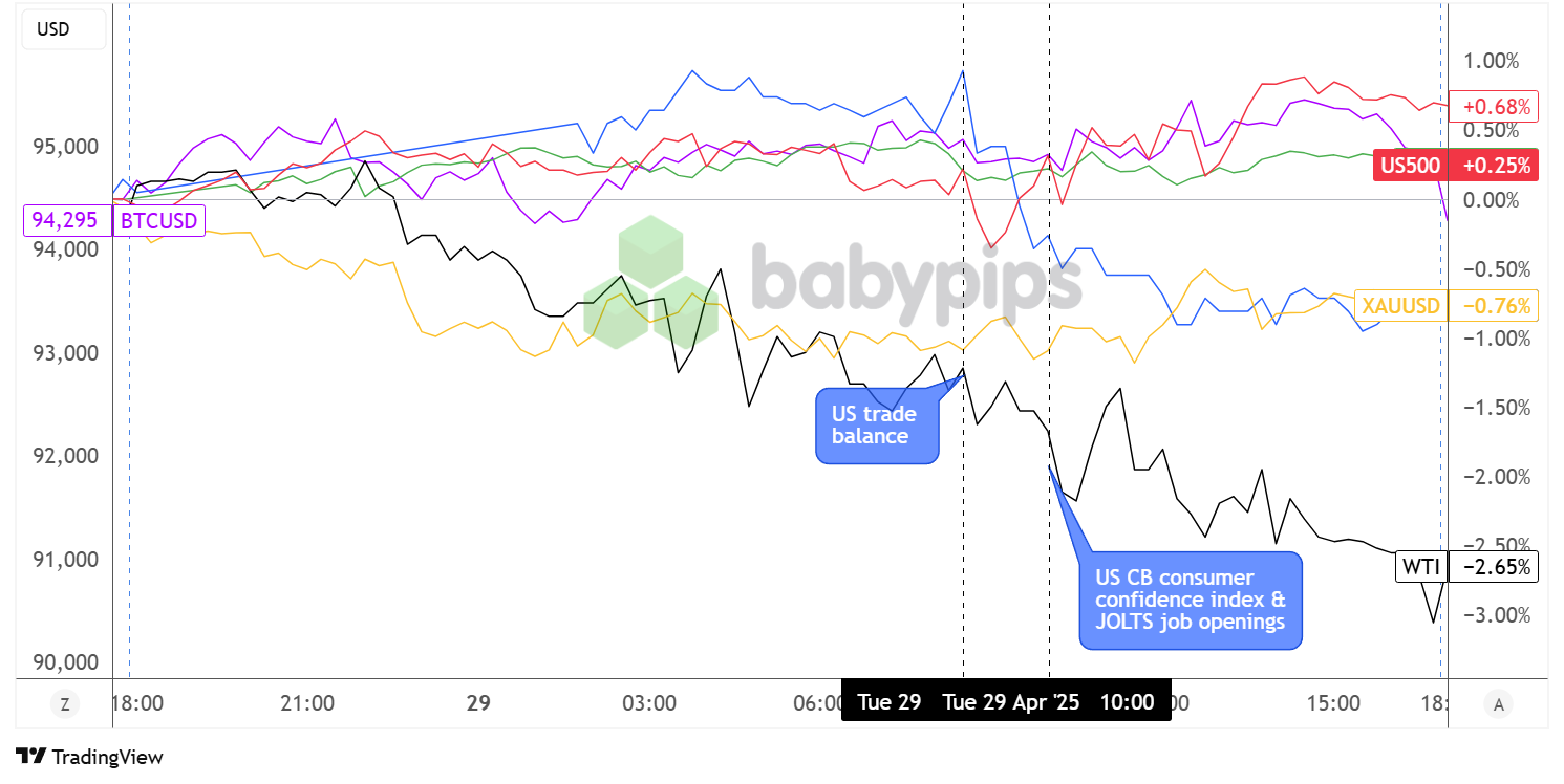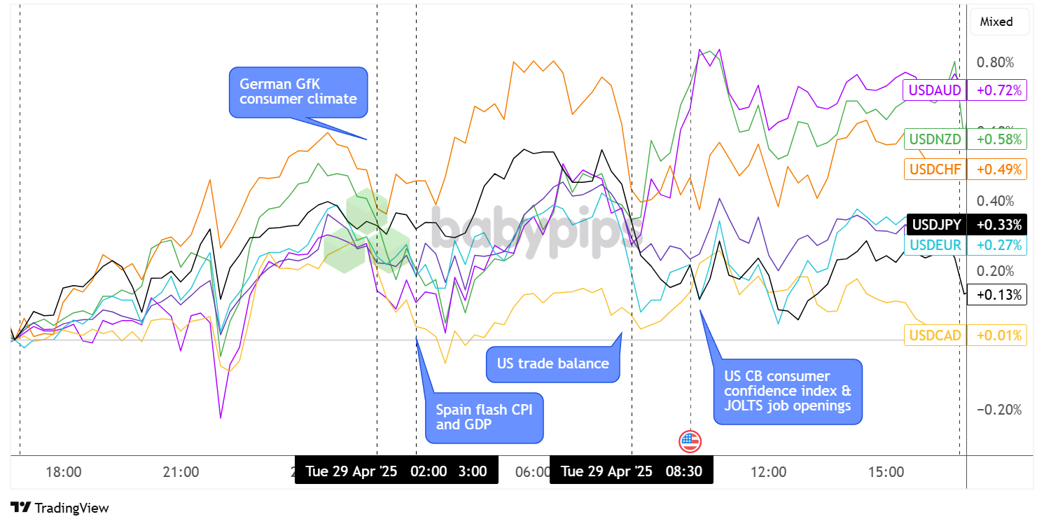 Still, USD managed to recover from its dive just before another round of weak data – this time from the CB consumer confidence survey and JOLTS job openings report – capped gains and led to sideways price action for the remainder of the session.